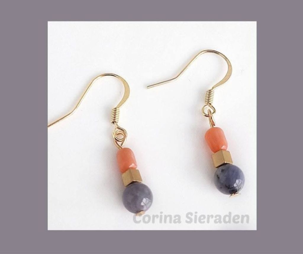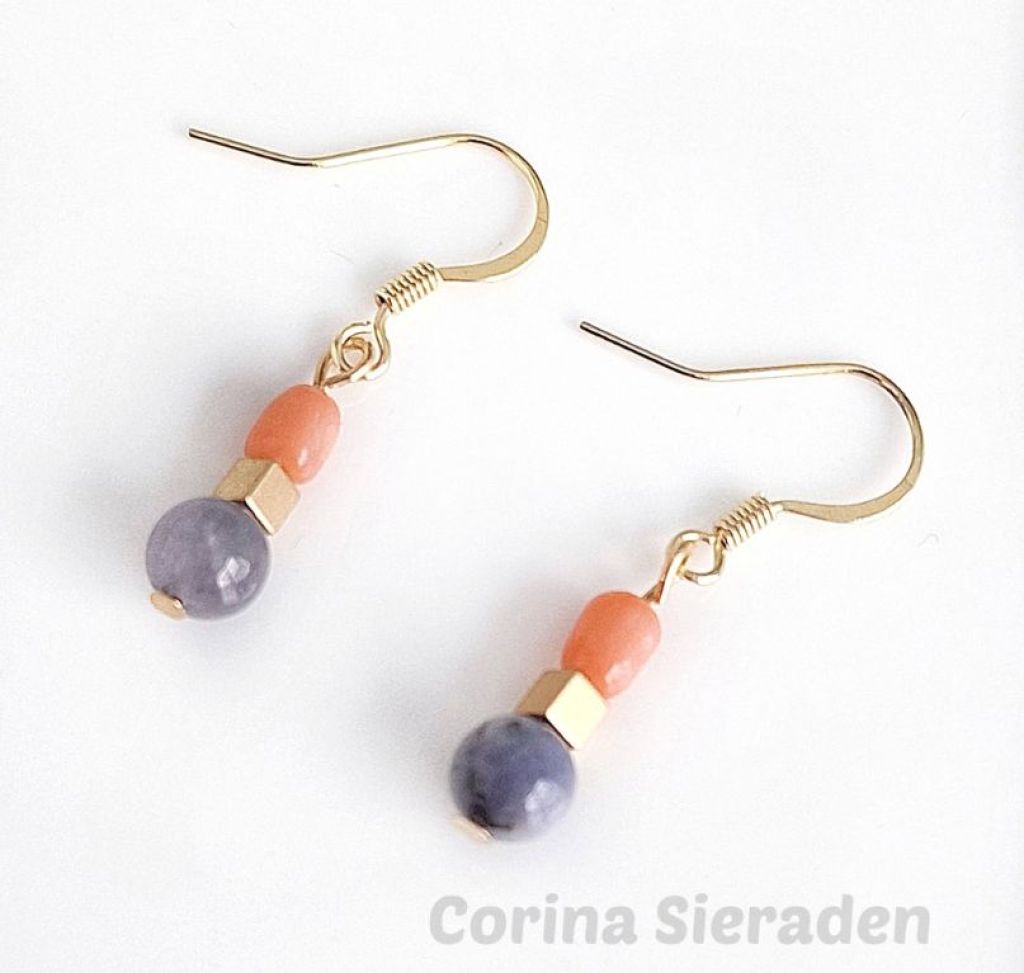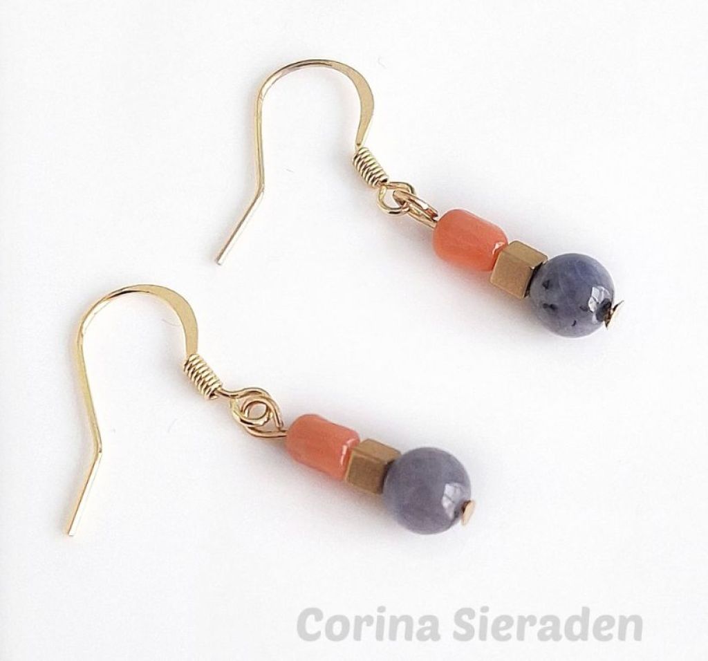 Deze oorhangers met tanzaniet, gekweekte koraal en vergulde hematiet zijn een echte eyecatcher. Speels, stijlvol en met de hand gemaakt