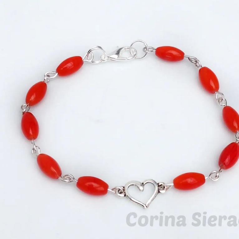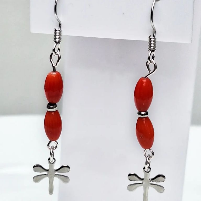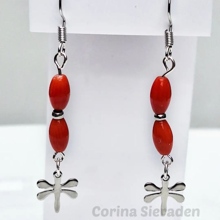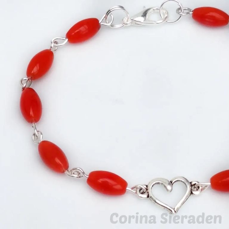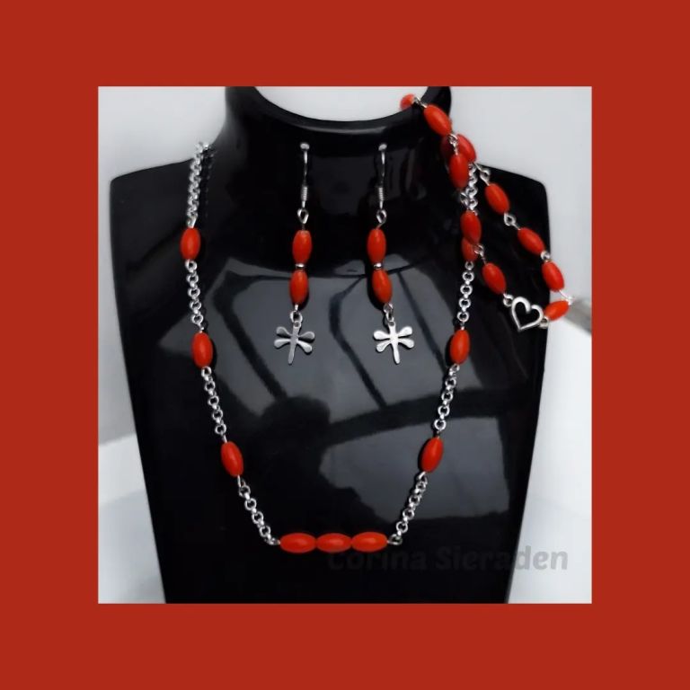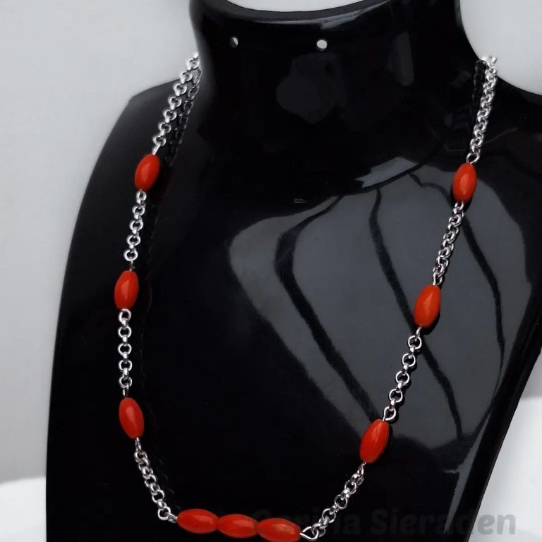 Sieradenset met gekweekte rode koraal en RVS: ketting: 51 cm, armband (geketteld): 18 cm, oorhangers: 5,5 cm.