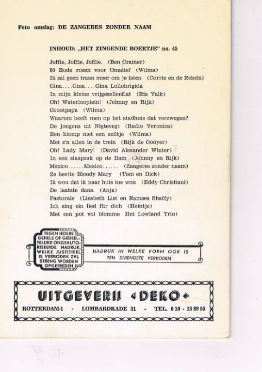 Uitg. Deko. Geschat eind jaren '50/begin jaren '60. Nieuwstaat. Geniet boekje. 16 pagina's. Met vele songteksten uit die tijd. In nieuwstaat zeer zeldzaam. Gewicht 29 gram. Verzendkosten: kan vanaf € 1,82 in de rode brievenbus, maar adviseer voor zekerheid track & trace vanaf € 3,95. Prijs € 14,95.
