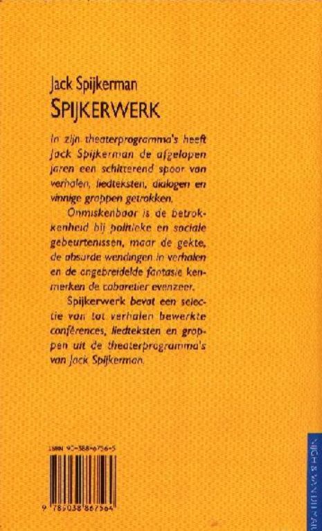 Spijkerwerk bevat een selectie van tot verhalen bewerkte conférances, liedteksten en grappen uit de theaterprogramma´s van Jack Spijkerman.