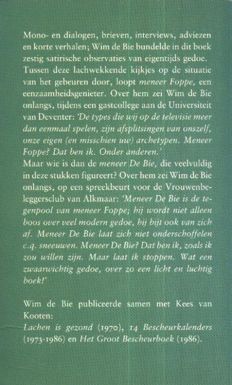Mono - en dialogen, brieven, interviews, adviezen en korte verhalen; Wim de Bie bundelde in dit boek zestig satirische observaties van eigentijds gedoe.
