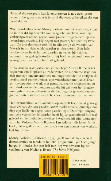 In De man die naar paarden luistert beschrijft Monty Roberts het begin van zijn loopbaan als rodeoruiter, de moeizame strijd om zich met zijn onconventionele trainingsmethoden te vestigen als professioneel paardentrainer, zijn vriendschap met James Dean, zijn therapeutische werk met getraumatiseerde racepaarden, en de indrukwekkende demonstratie die hij gaf voor het Engelse koningshuis - een gebeurtenis die het begin is geweest van een golf van internationals aandacht voor zijn manier van werken.