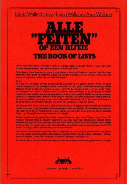 De bekende Amerikaanse schrijver Irving Wallace , zijn zoon David en zijn dochter Amy verzamelden een grote hoeveelheid lijsten en stelden hiermee een overzicht samen van een aantal intrigerende 'feiten' en veronderstellingen.