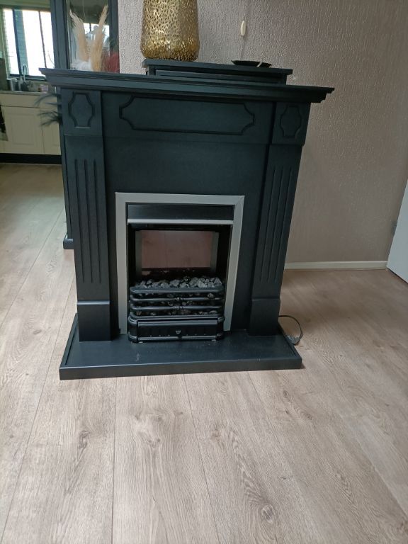 Leuke schouw met elektrisch kacheltje, kan met en zonder warmte branden. 1 meter hoog en 1 meter breed