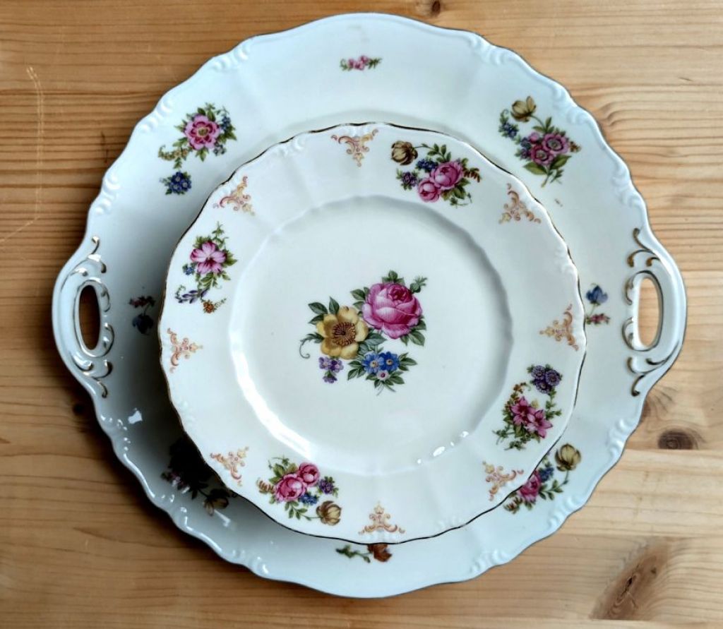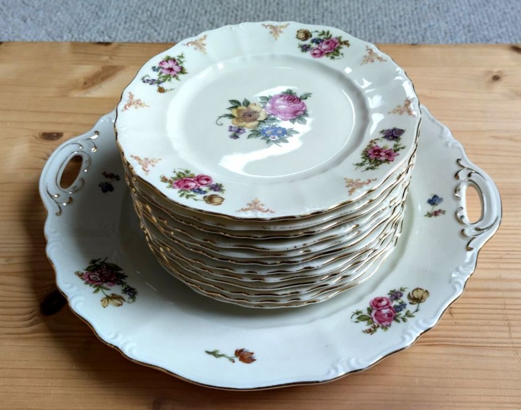 Vintage gebakstel 12 bordjes + schaal zeer mooie staat