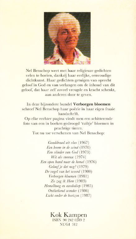 In deze bijzondere bundel Verborgen bloemen schreef Nel Benschop haar poezie in haar eigen fraaie handschrift.