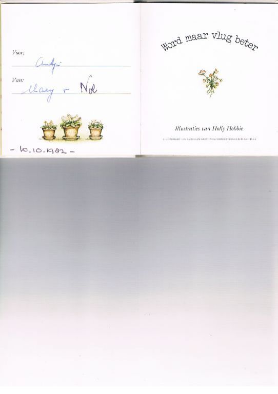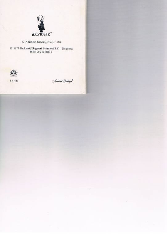 Uitg. Helmond. 1977. Serie Holly Hobbie. Klein gebonden boekje 11 x 12 cm. 20 pagina's. Binnenin opdracht voor zieke geschreven. Je zou er een stukje papier over kunnen plakken. Verder in zeer goede staat. Gewicht 52 gram. Prijs € 1,25. Verzendkosten vanaf € 2,61.