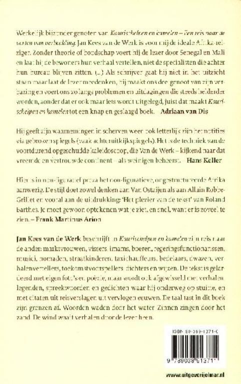 Jan Kees van de Werk beschrijft in Kaurischelpen en kamelen zijn reis naar de ander: marktvrouwen, vissers, imams, boeren, regeringsfunctionarissen, musici, nomaden, straatkinderen, taxichauffeurs, bedelaars, dwazen, verhalenvertellers, toekomstvoorspellers, dichters en wijzen.