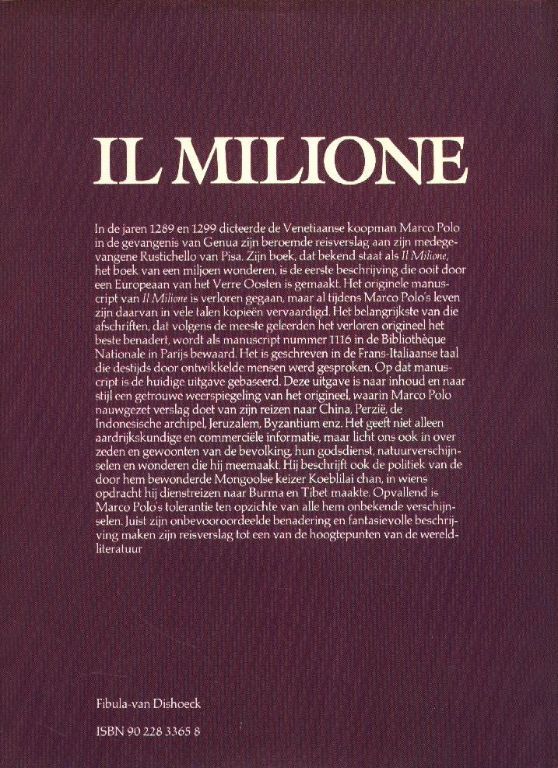 Zijn boek, dat bekend staat als IL Milione, het boek van een miljoen wonderen, is de eerste beschrijving die ooit door een Europeaan van het Verre Oosten is gemaakt.