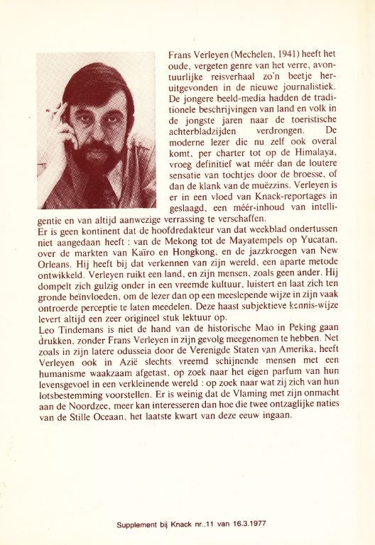 Frans Verleyen (Mechelen, 1941) heeft het oude, vergeten genre van het verre, avontuurlijke reisverhaal zo'n beetje heruitgevonden in de nieuwe journalistiek.