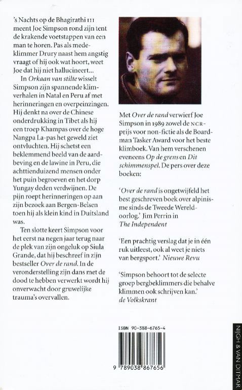 In Orkaan van stilte wisselt Simpson zijn spannende klimverhalen in Natal en Peru af met herinneringen en overpeinzingen.