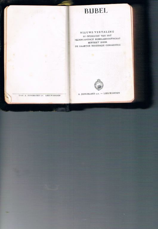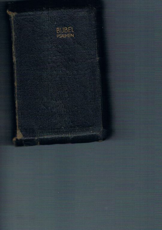 Uitg. Nederlandsch Bijbelgenootschap. 1946. N.T. 412 pagina's. De Psalmen. 154 pagina's. Formaat 9,5 x 12,5 cm. Gebonden Opdracht en naam op 2e schutblad. Dikte 1,5 cm. Lichtgekleurde rug een beetje vervuild en verschoten. Verder ...