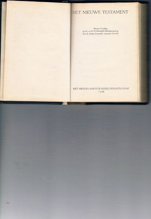 Uitg. Nederlandsch Bijbelgenootschap. 1946. N.T. 412 pagina's. De Psalmen. 154 pagina's. Formaat 9,5 x 12,5 cm. Gebonden Opdracht en naam op 2e schutblad. Dikte 1,5 cm. Lichtgekleurde rug een beetje vervuild en verschoten. Verder in zeer goede staat. Gewicht 156 gram. Verzendkosten met track & trace vanaf € 3,95. Prijs € 7,50.