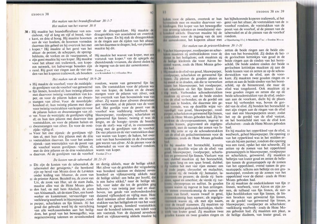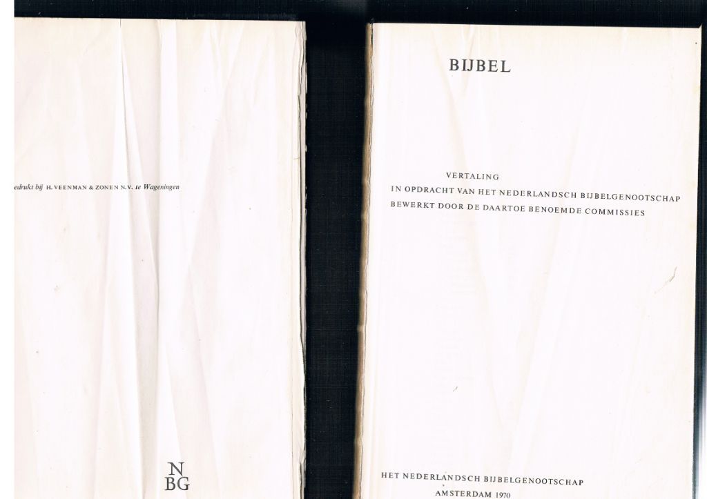 Uitg, Nederlandsch Bijbelgenootschap. 1970. Inhoud Oude en Nieuwe Testament. Gebonden. Voorin is een blaadje gelijmd met de mededeling, dat de bijbel is aangeboden ter gelegenheid van een huwelijk in 1972. 1150 pagina's. Dikte 3,8 cm. Gewicht 986 gram. Waarschijnlijk is het boek een keer ongelukkig gevallen, want de voorkaft met schutblad en een dun vel als eerste titelblad, blijkt te zijn losgescheurd van het boekblok. Normaal moet een stevig schutblad het gewicht kunnen houden, maar hier ging het fout. Reparatie lijkt mij het beste met een lijmstift. Niet ideaal, maar het beste in deze situatie. Plakband is uit den boze; dat wordt een bende. De eerste en laatste pagina hebben wat kreukels. Verder is het boek in zeer goede staat. En een behoorlijk leesbare letter. Verzendkosten met track & trace vanaf € 4,50. Prijs € 9,95.