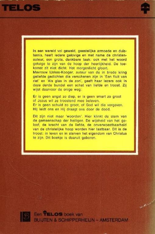 Mevrouw IJskes-Kooger, auteur van de in brede kring geliefde gedichten die verschenen zijn in 'Een fluit van riet' en 'Als glas in de zon', geeft haar lezers ook in deze derde bundel een scaht van liefde en troost.
