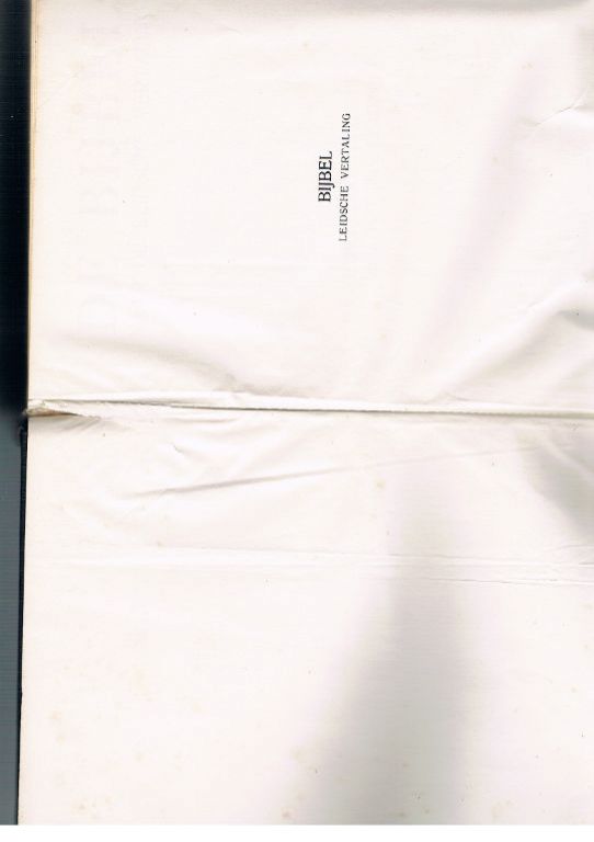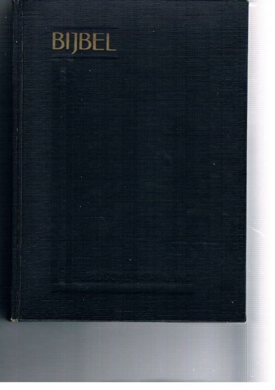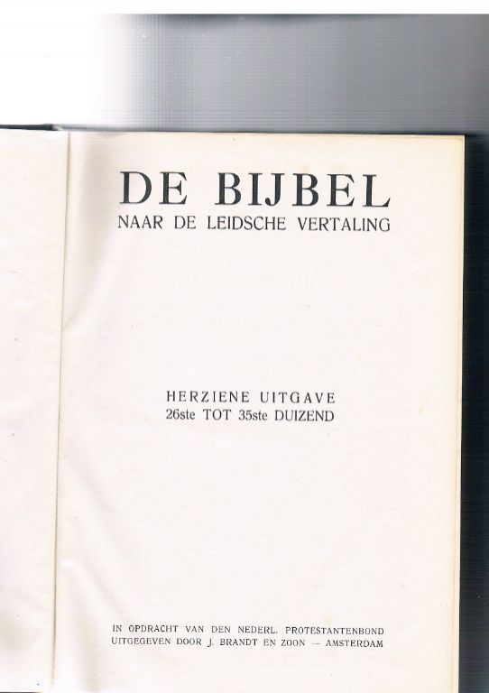 Uitg. J. Brandt en zoon. Gebonden. Met het Oude en Nieuwe Testament. 1336 pagina's. Formaat 18 x 24,5 cm. Dikte 5 cm. Gewicht 1688 gram. Op de laatste pagina staat vermeld K 2597. Dit betekent dat het boek is uitgegeven tijdens WO ii. Op last van de Duitse bezetter moest in elk toegelaten boek een K nummer worden vermeld. Leeftijd dus ca. 80 jaar. In deze bijbel wordt ook de oude spelling gebruikt.