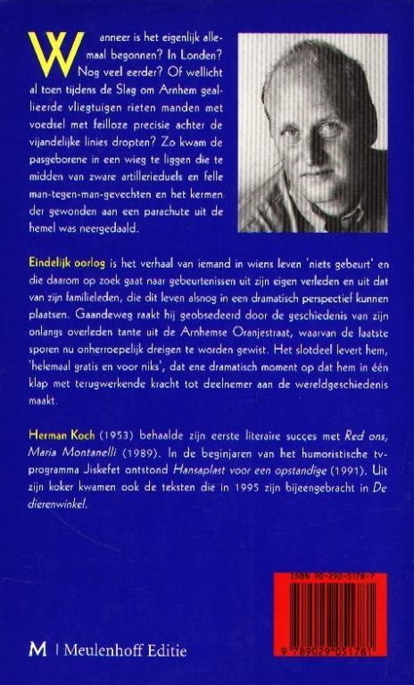 Eindelijk Oorlog is het verhaal van iemand in wiens leven 'niets' gebeurt en die daarom op zoek gaat naar gebeurtenissen uit zijn eigen verleden en uit dat van zijn familieleden, die dit leven alsnog in een dramatisch perspectief kunnen plaatsen.