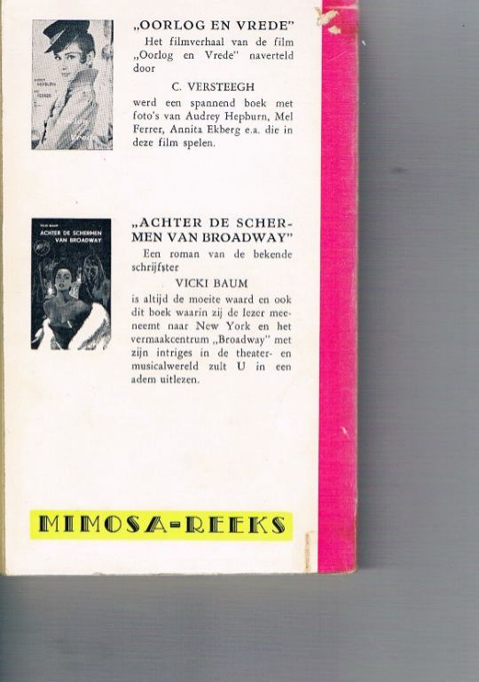 Uitg. Leiter-Nypels. Mimosa-reeks. Omstreeks 1956. Pocket. Met 16 pagina's zwart-wit foto's uit de gelijknamige film met Romy Schneider. 182 pagina's. Dikte 1,3 cm. Gewicht 142 gram. Het boekje is in vrij goede staat met lichte gebruikssporen. Verzendkosten vanaf € 3,95. Prijs € 9,50.