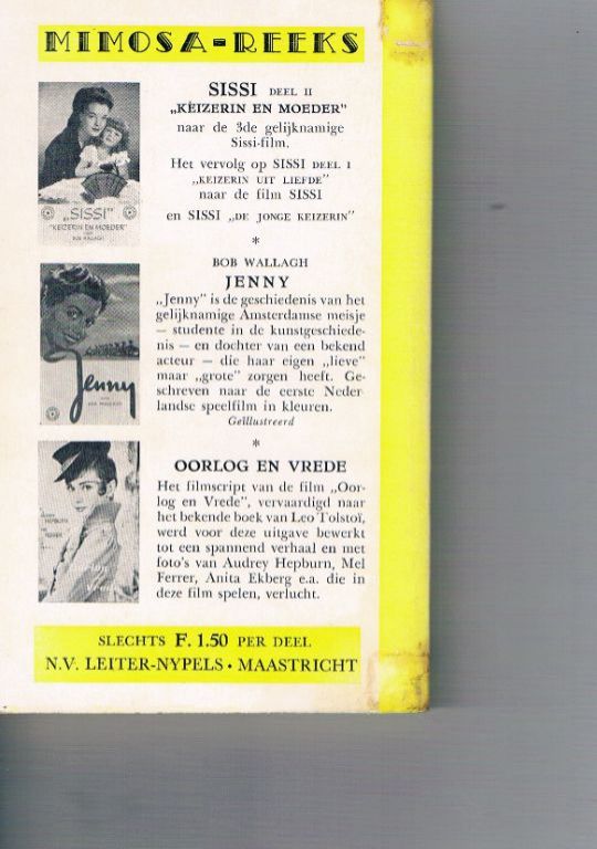 Uitg. Leiter-Nypels. Mimosa-reeks. Omstreeks 1956. Pocket. Met 16 pagina's zwart-wit foto's uit de gelijknamige film met Romy Schneider. 182 pagina's. Dikte 1,3 cm. Gewicht 144 gram. Het boekje is in vrij goede staat met lichte gebruikssporen. Verzendkosten vanaf € 3,95. Prijs € 9,50.