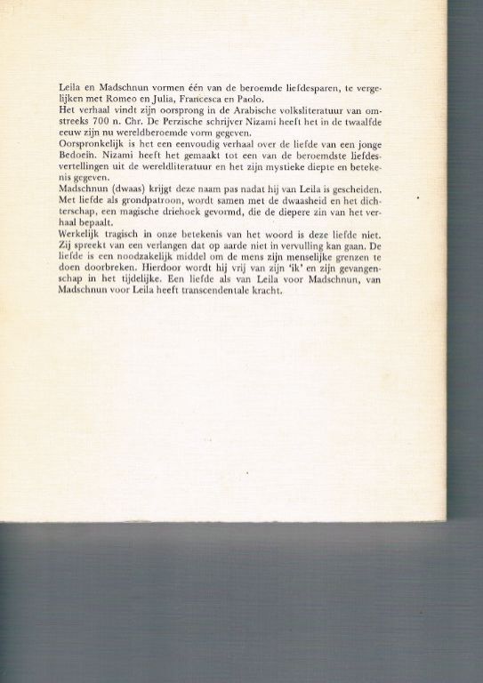 Uitg. Mirananda. 1978. Paperback. 165 pagina's. Formaat 17 x 19,8 cm. Ik zie één illustratie in de vorm van een – kennelijk Perzische – prent, welke is geplakt op de achterzijde van het eerste titelblad. Leila en Madschnun is één van de beroemde liefdesparen, te vergelijken met o.a. Romeo en Julia. Met potlood is er een naam in geschreven en zijn op pagina 8 enkele zinnen licht onderstreept. Het boek is in zeer goede staat. Dikte 1,8 cm. Gewicht 294 gram. Verzendkosten vanaf € 3,95. Prijs € 23,50.