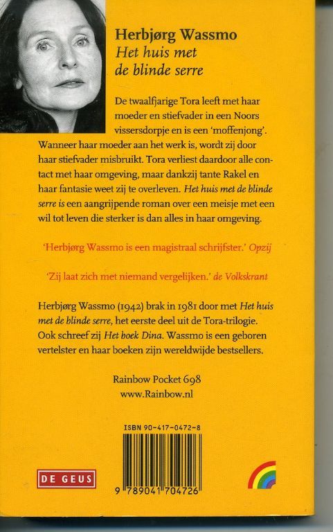 Het eerste deel van de Tora-trilogie. Het huis met de blinde serre de twaalfjarige Tora leeft met haar moeder en stiefvader in een Noors vissersdorpje en is een “moffenjong”. Wanneer haar moeder aan het werk is, wordt zij door haar stiefvader misbruikt. Tora verliest daardoor alle contact met haar omgeving, maar dankzij tante Rakel en haar fantasie weet zij te overleven. Het huis met de blinde serre is een aangrijpende roman over een meisje met een wil tot leven die sterker is dan alles in haar omgeving. 1e deel het huis met de blinde serre 2e deel de stille kamer 3e deel de huidloze hemel