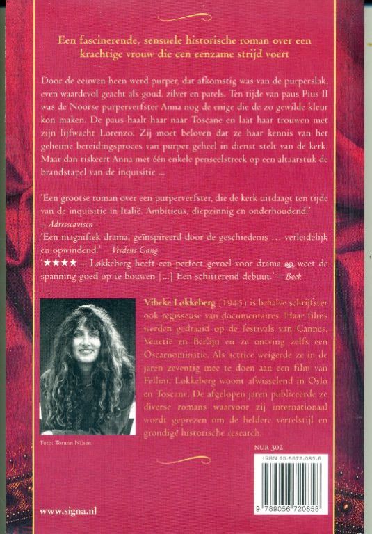 Door de eeuwen heen werd purper even waardevol geacht als goud, zilver en parels. Ten tijde van paus Pius II was de Noorse purperverfster Anna nog de enige die de zo gewilde kleur kon maken. De paus haalt haar naar Rome zodat ze haar kennis geheel in dienst kan stellen van de kerk. Maar dan riskeert Anna met één enkele penseelstreek op een altaarstuk de brandstapel van de inquisitie. Door haar leven ze lf in handen te nemen en door haar gedrevenheid weet zij echter haar dood te voorkomen.Auteur: Vibeke LøkkebergUitgave –Pocket