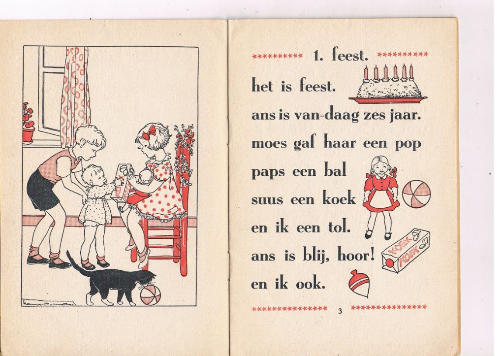Uitg. Kluitman. 1948. Bedoeld voor de eerste klas Lagere School. 16 pagina's. Formaat 13,5 x 19,8 cm. Geschreven door Elise Bronkhorst en geïllustreerd door Nans van Leeuwen (bekend van o.a. Piggelmee). Wat lichte gebruikssporen, ...
