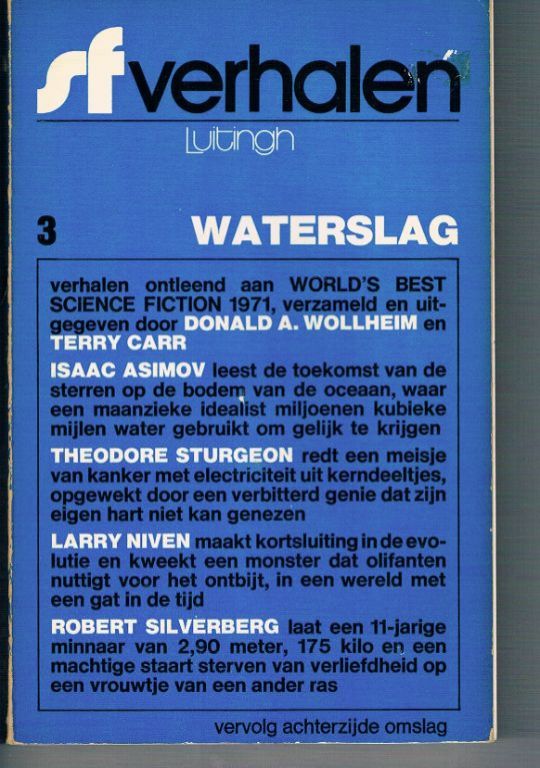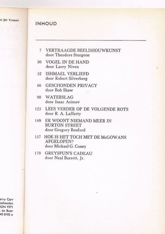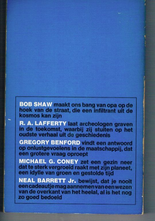 Uitg. Luitingh. 1971. Paperback. 192 pagina's. Dikte 1,7 cm. Gewicht 255 gram. In het boek staan diverse korte SF verhalen (zie foto). Het boek is in vrij goede staat. Door de slechte lijming zijn helaas de pagina's 1 t/m14 losgelaten. Met een lijmstift is dit redelijk te verhelpen. Voor deze relatief zeldzame uitgave (ik had hem nog niet eerder gezien) vraag ik slechts € 7,50. Verzendkosten vanaf € 3,64.