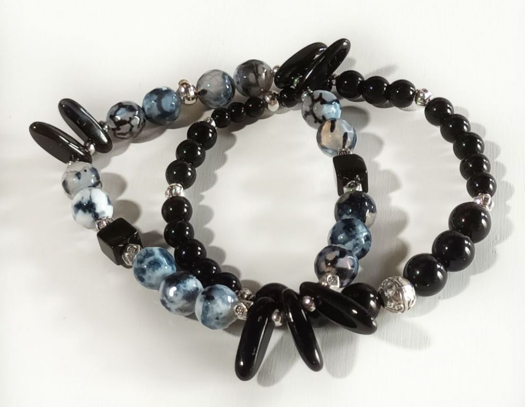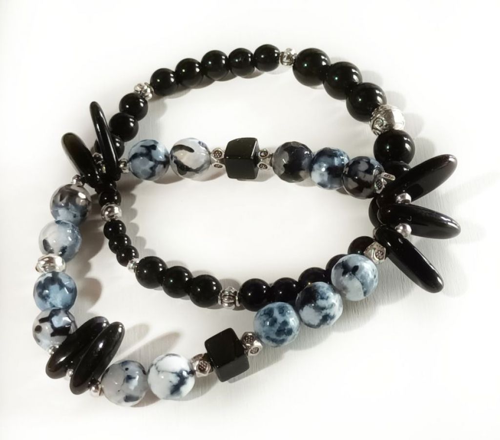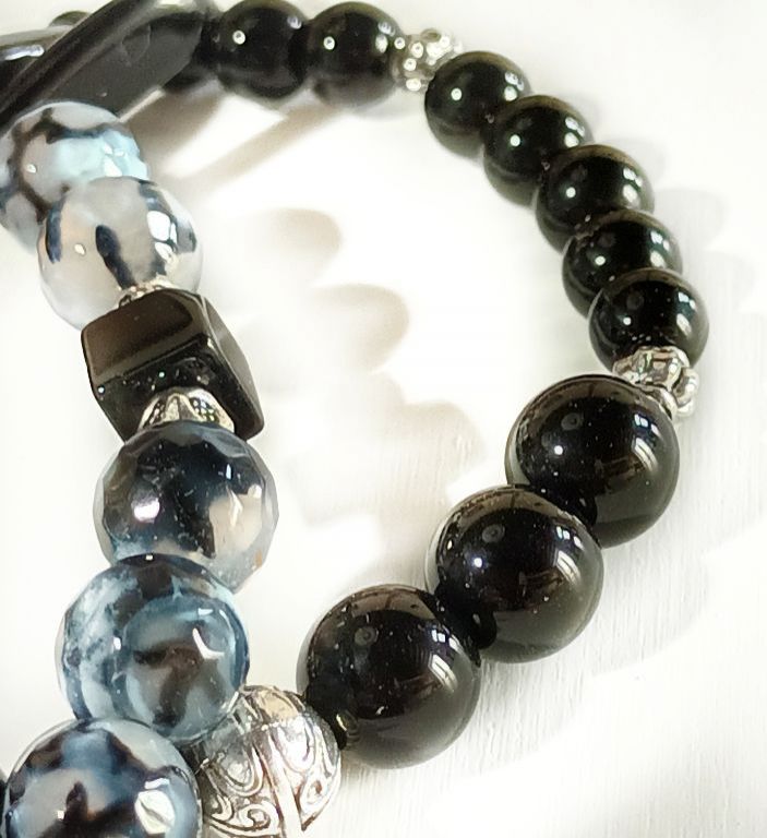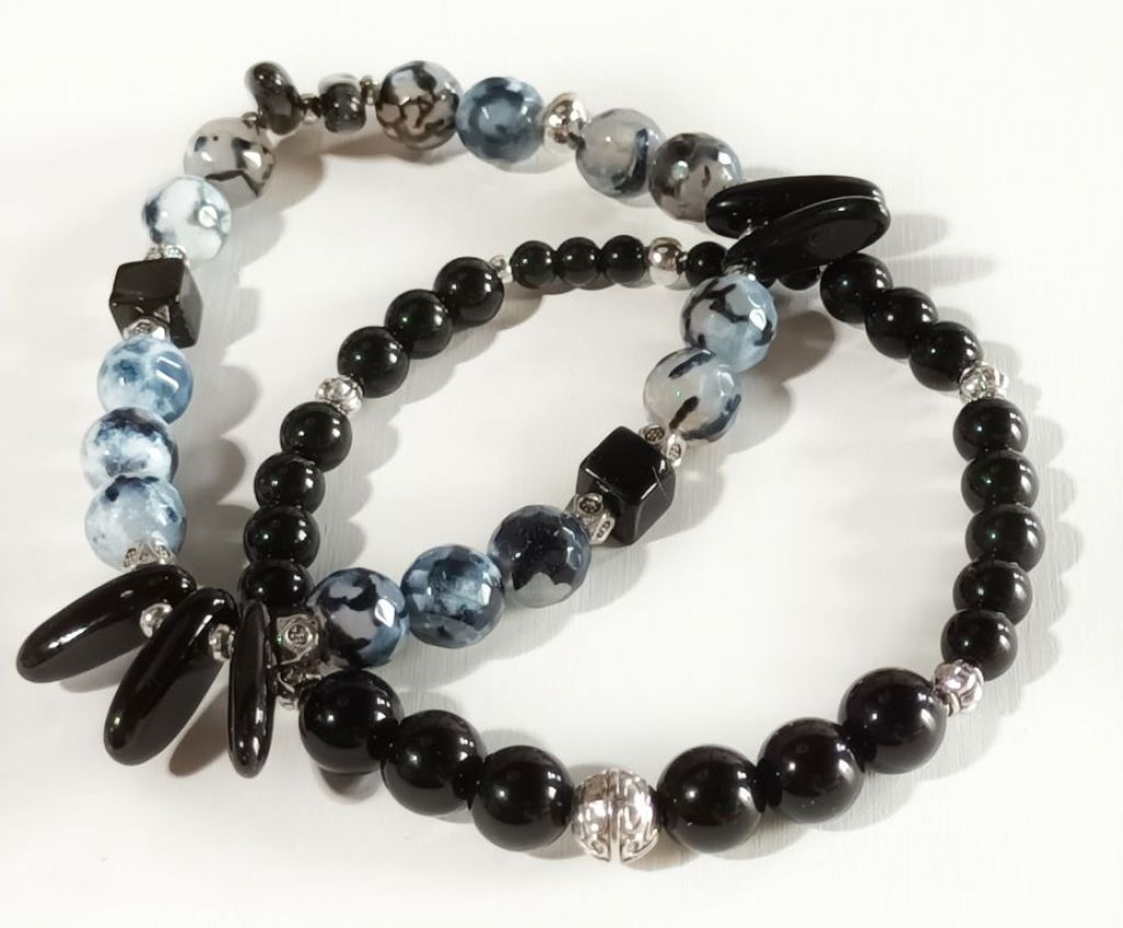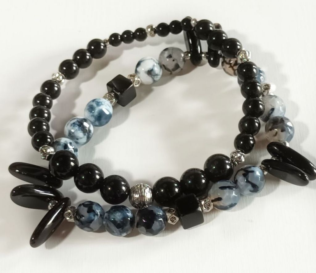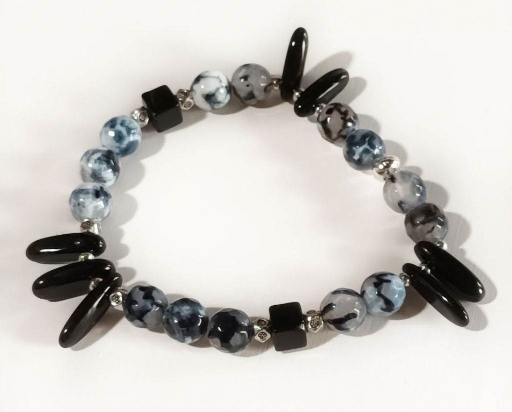 CORINA SIERADEN Dubbele armband van amazoniet, facetgeslepen chalcedoon, Botswana agaat (cilinder) en brons, met bedel schelp. Polsmaat 19 cm. In de webshop vind je bijpassende oorhangers (zie laatste foto)