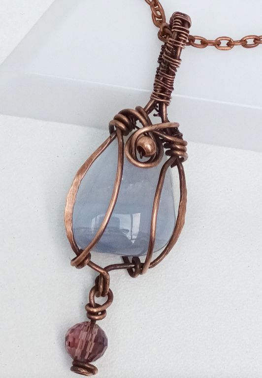 Wire wrapped hanger met blauwe, onregelmatige aventurijn in geoxideerd koperdraad, met Swarovski bedel.