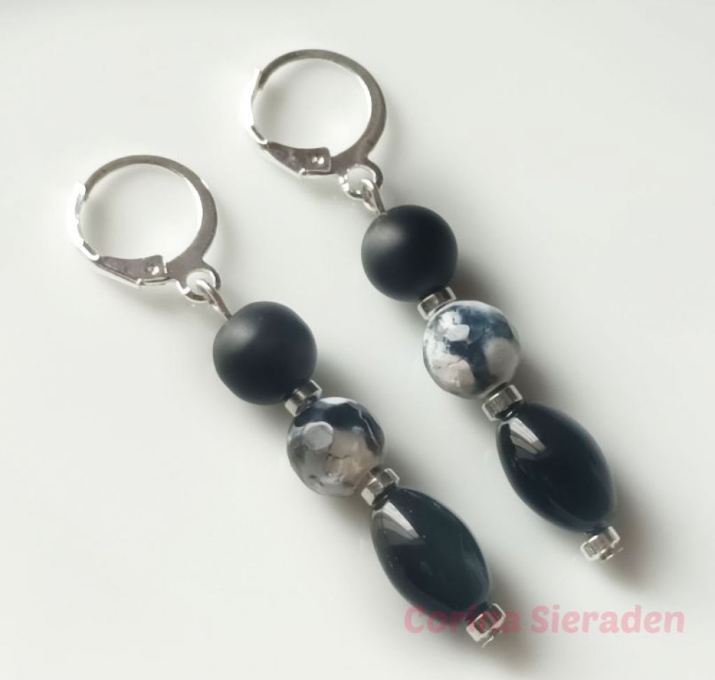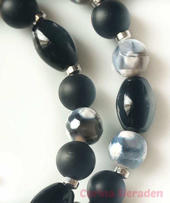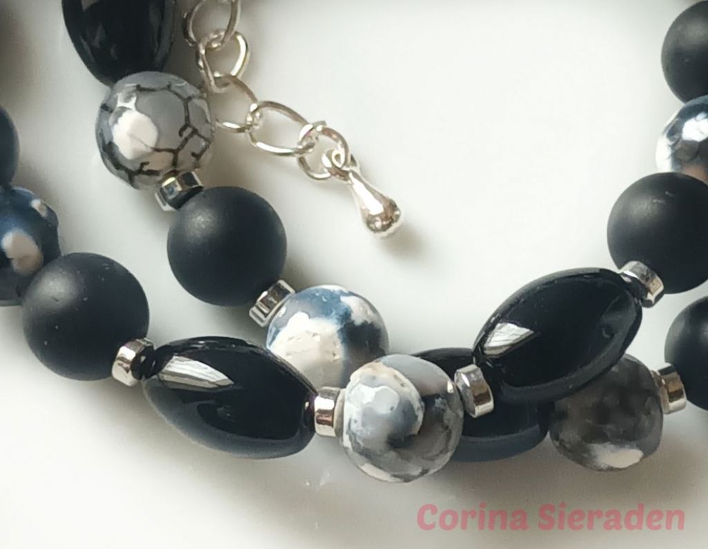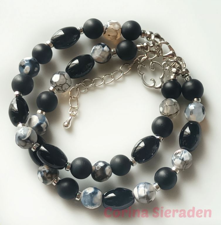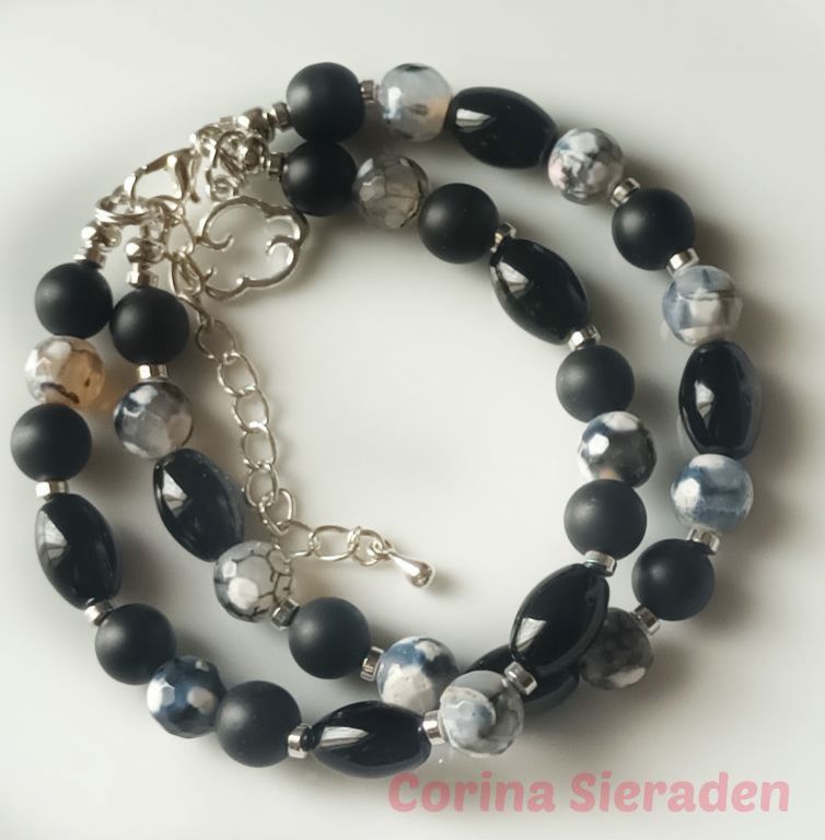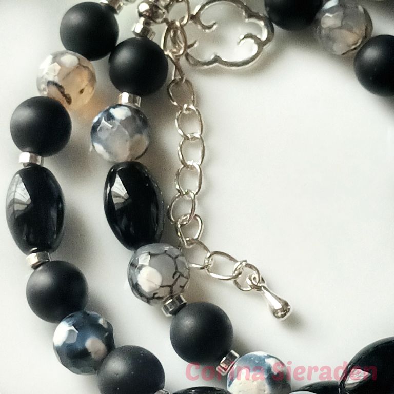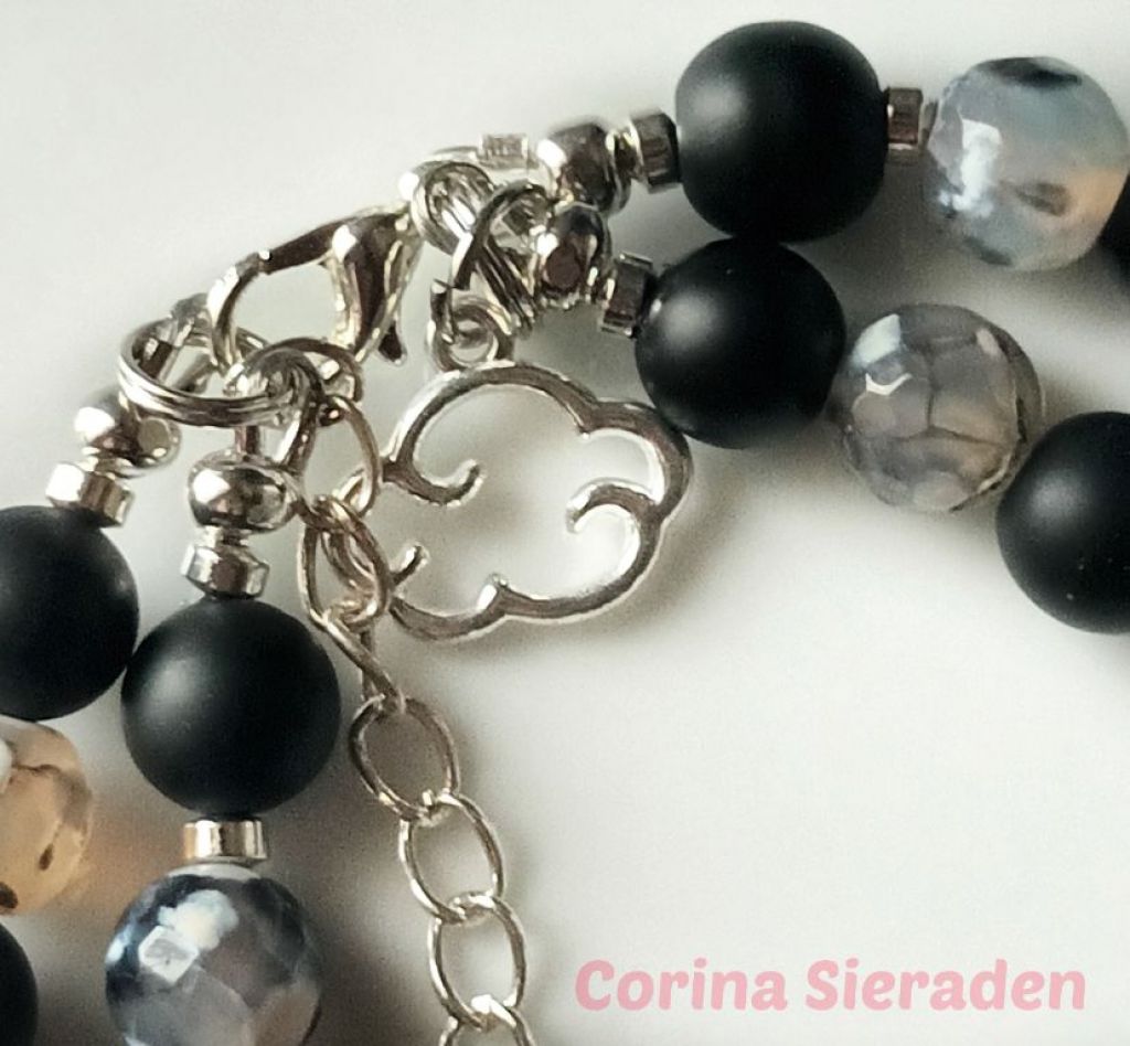 Dubbele armband van onyx (mat 8 mm en ovaal 8 x 12 mm), crackle agaat (8 mm) en hematiet, met bedel wolkje en verlengkettinkje.