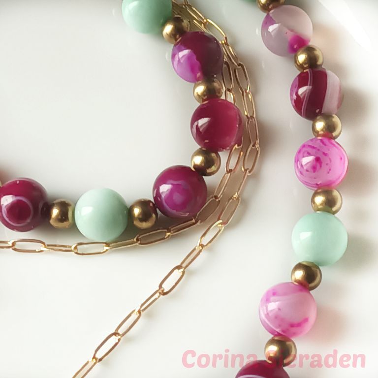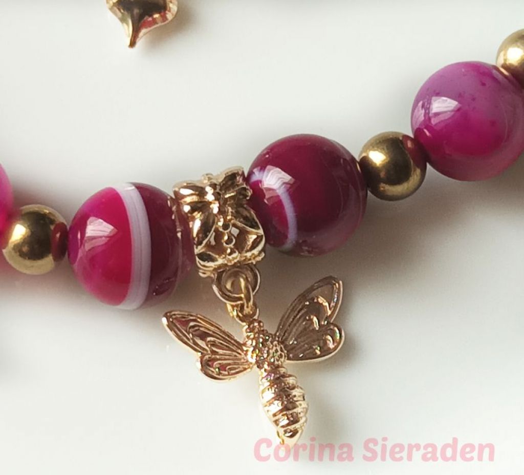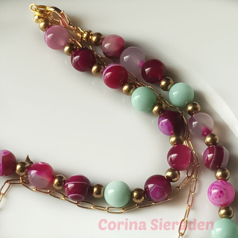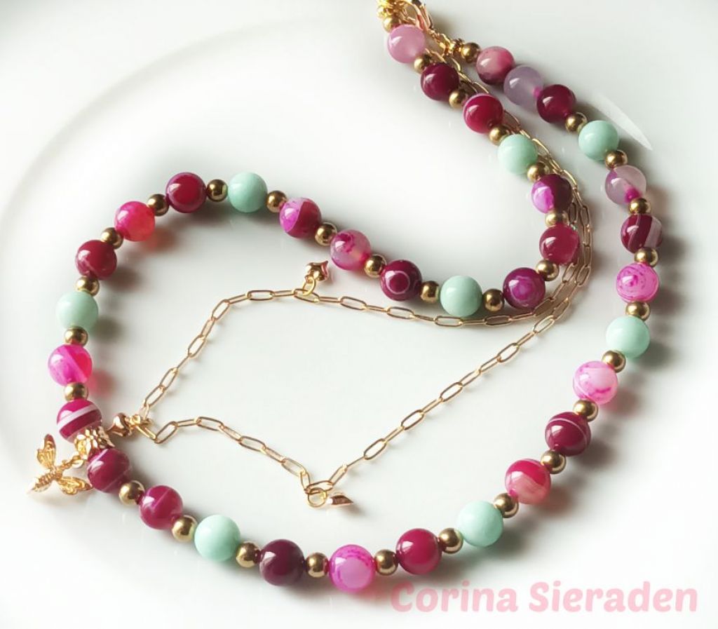 Prachtige ketting (dubbel snoer) van sardonyx (10mm), aquamarijn (10 mm) en messing, met bedel van bij en jasseron met bedeltjes hart.