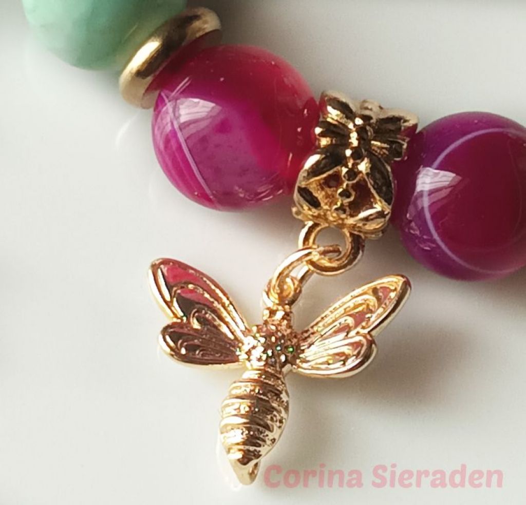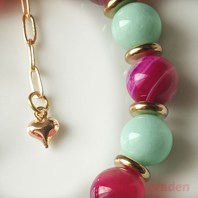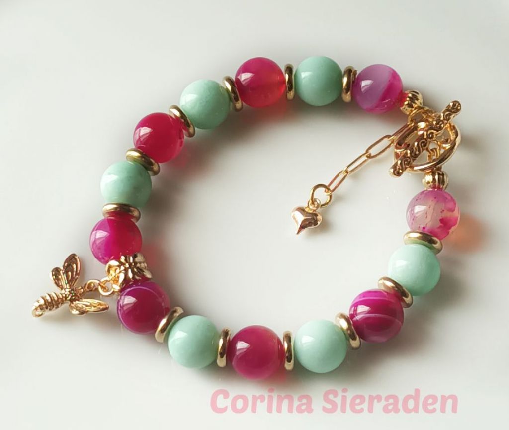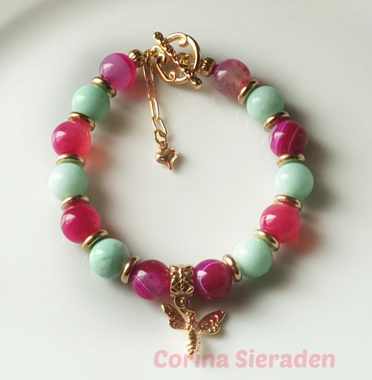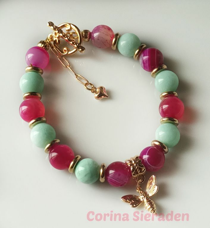 Bijzonder mooie armband van sardonyx (10mm), aquamarijn (10 mm) en messing, met bedel bij en prachtig kapittelslot. Alles is van AA kwaliteit.