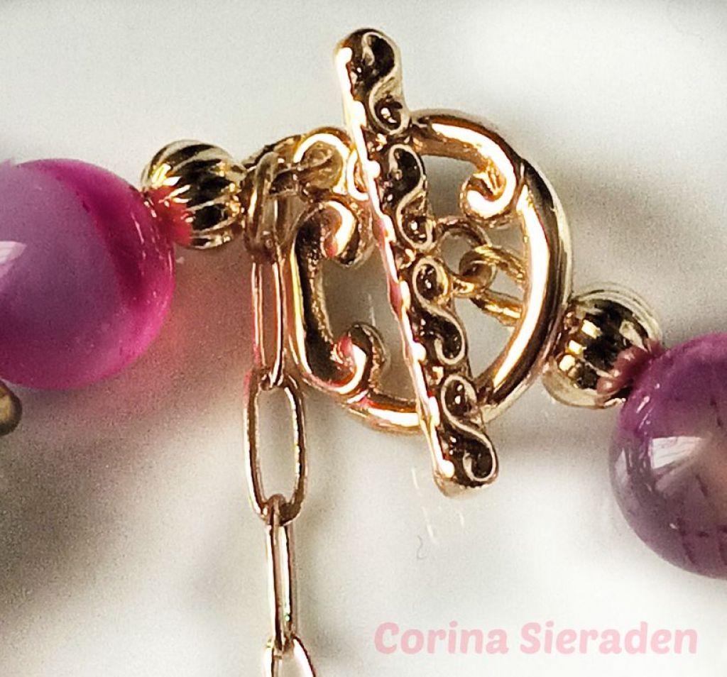 CORINA SIERADEN Armband van electroplated rhodoniet (8 en 10 mm) en verzilverde hematiet (4 en 6 mm), met verzilverde bedel hoefijzer (strass) en verlengkettinkje. Polsmaat: 17-23cm.