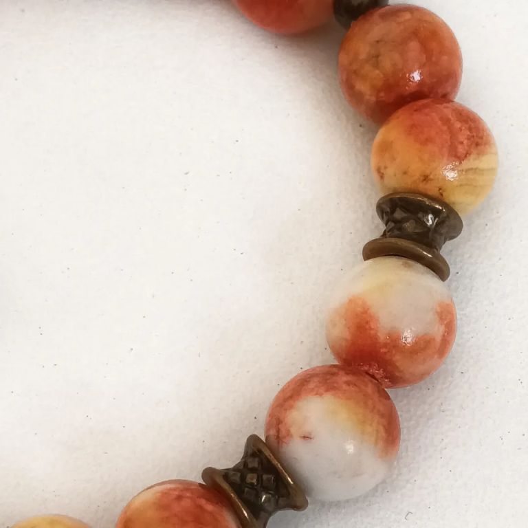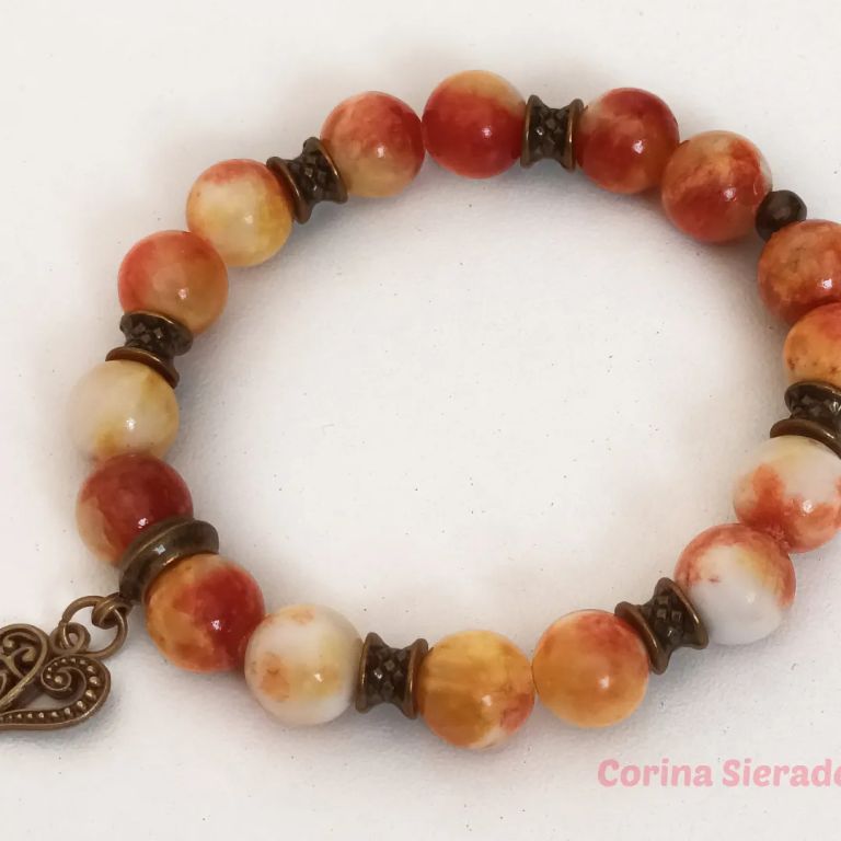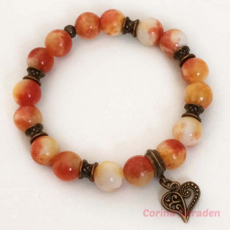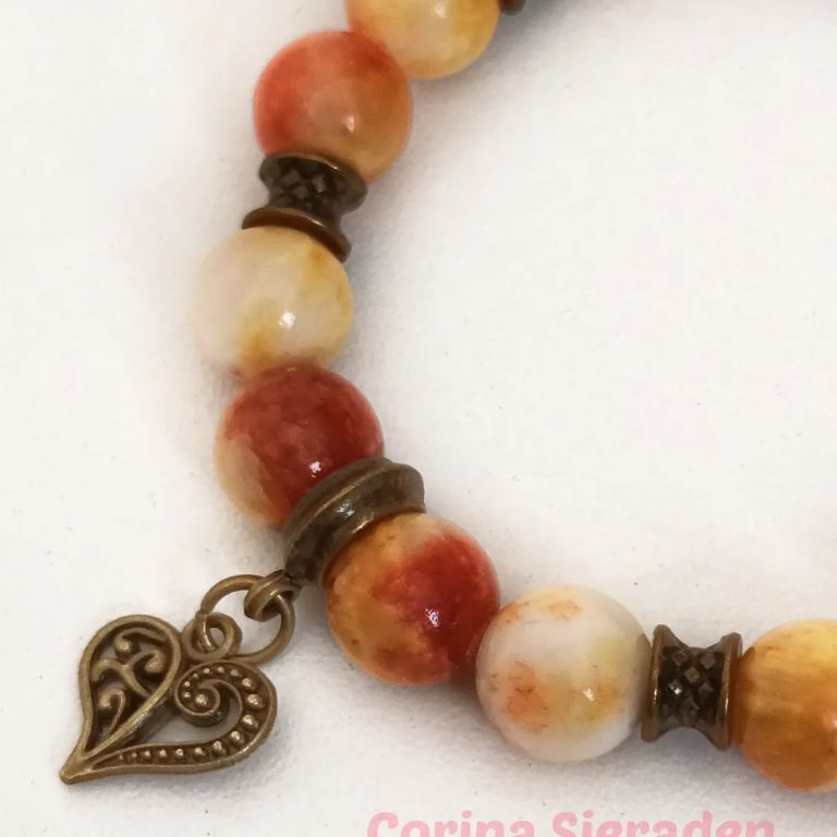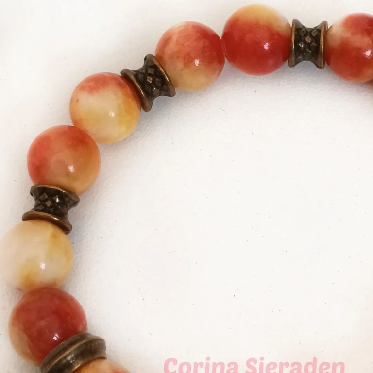 Armband van persian jade (bijgekleurd 10 mm) en brons, met bedel, geregen op elastiek.