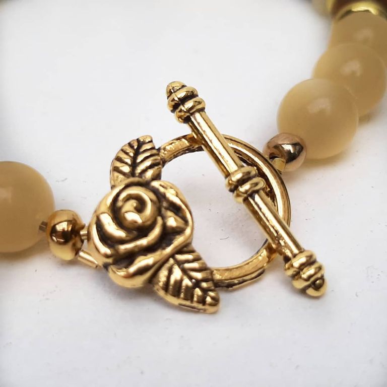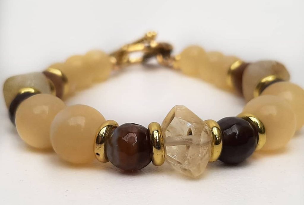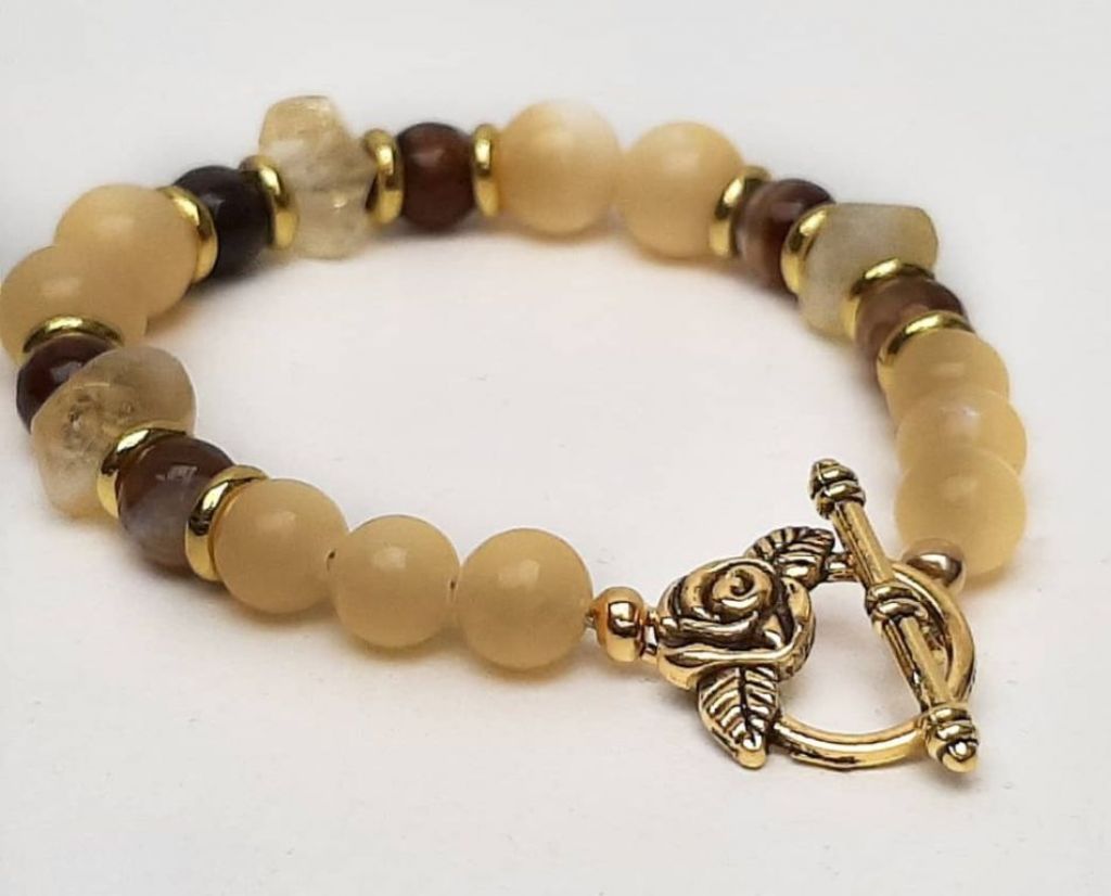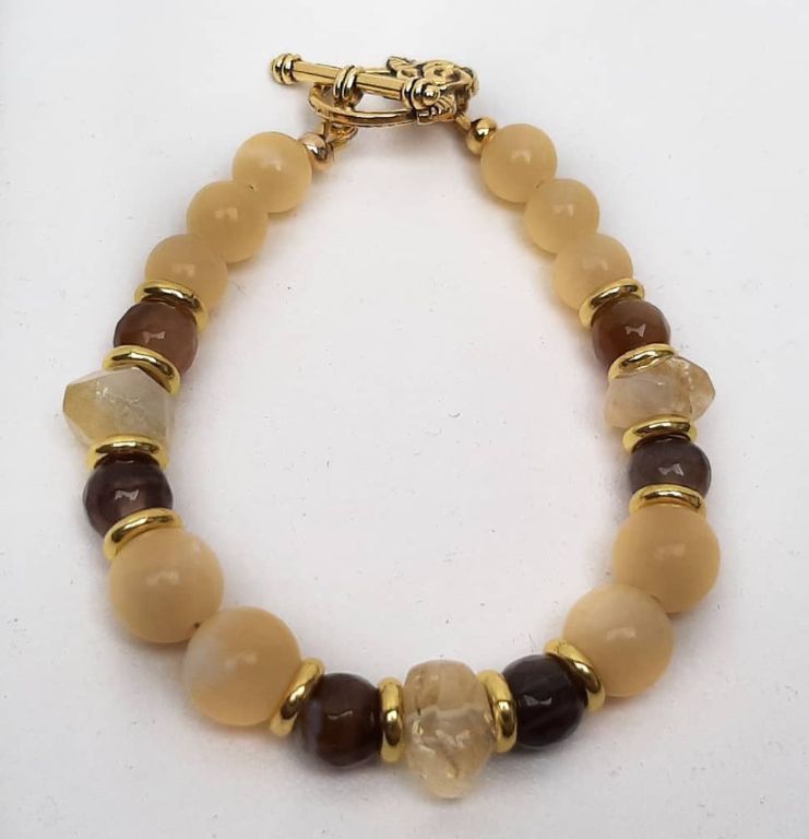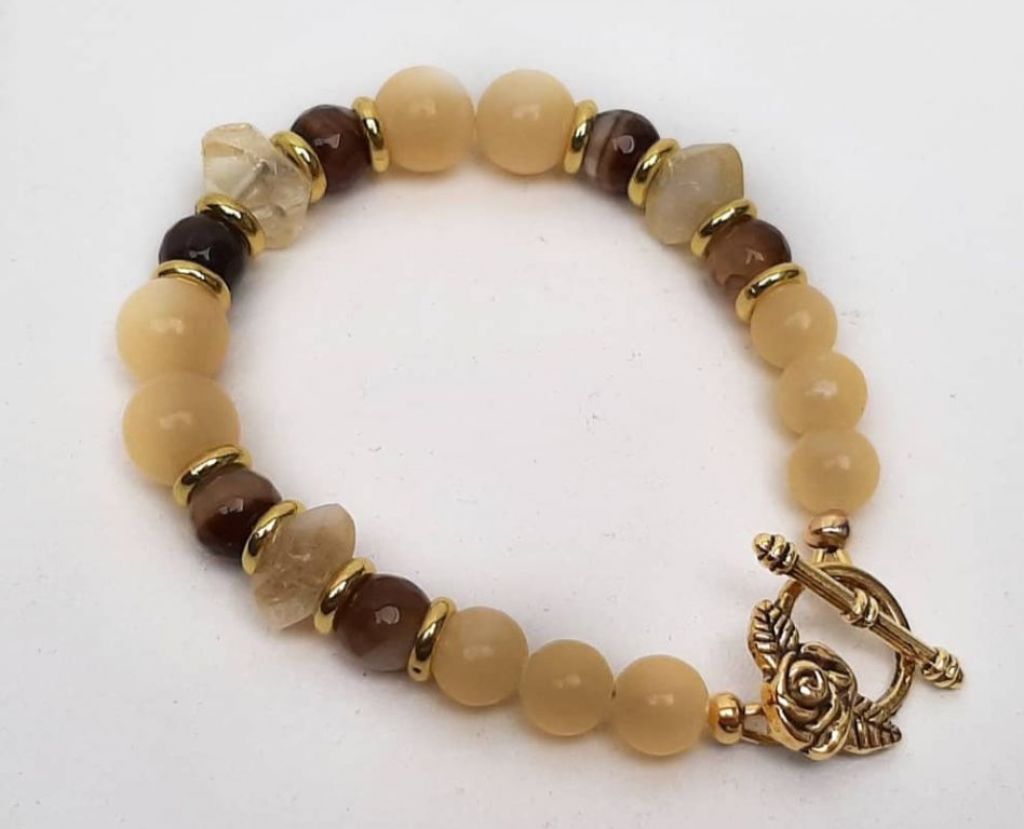 Zomerse armband van topaas jade, onregelmatige citrien, facetgeslepen striped agaat en goudkleurige spacers, met kapittelslot roos.
