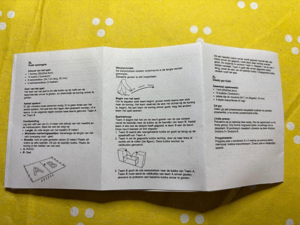 Houten onderdelen : 1 koning , 10 kubbs , 6 werpstokken en 4 markeerstokken .
