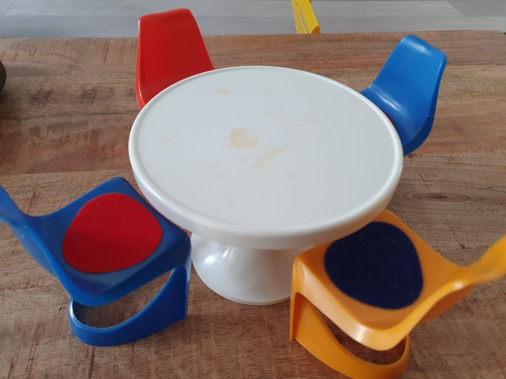 retro tafel en 4 stoeltjes voor Barbiemerk Helly: no 514in goede staat, tafeltje heeft wel een paar vlekken
