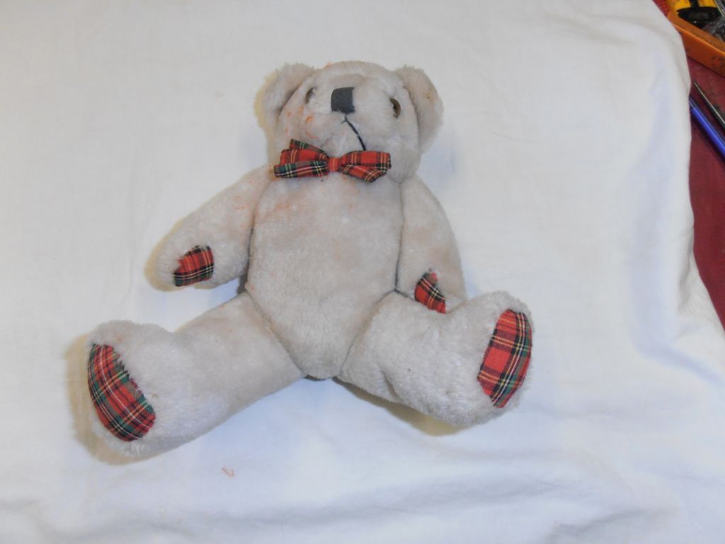 Het was waarschijnlijk de bedoeling dat deze beer een zittend leven zou leiden. Of het een constructiefout is of een andere oorzaak: geen idee. Maar de beer kan alleen liggen. Lengte exclusief benen ca. 20 cm. Breedte van de gespreide benen ca. 20 cm. In zeer goede staat. Verzendkosten vanaf € 4,50. Prijs € 9,95.