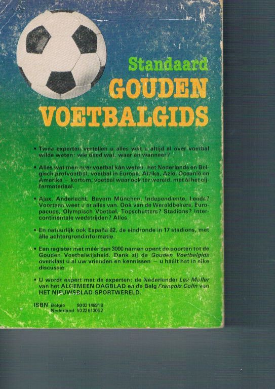 Uitg. Moussault. Eerste druk 1982. Paperback. 382 pagina's. Dikte 2,5 cm. Gewicht 656 gram. Met een overzicht van de nationale ploeg, de interlands, het clubvoetbal, de Europa Cup. En dat door de jaren heen en voor diverse Europese landen. Mogelijk heb ik nog enkele onderwerpen over het hoofd gezien. En voorzien van talrijke zwart-wit foto's. In de loop der tijd heeft het boek enkele gebruikssporen opgelopen; tussen pagina 114 en 115 heeft de lijming losgelaten (meestal met een plakstift te herstellen). Verzendkosten vanaf € 4,25. Prijs € 3,50.