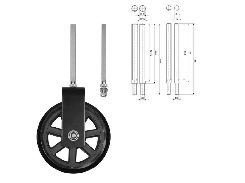 Wiel met 2 verschillende diktes stangen om de pin te vervangen en zo de bas rollend te kunnen vervoeren