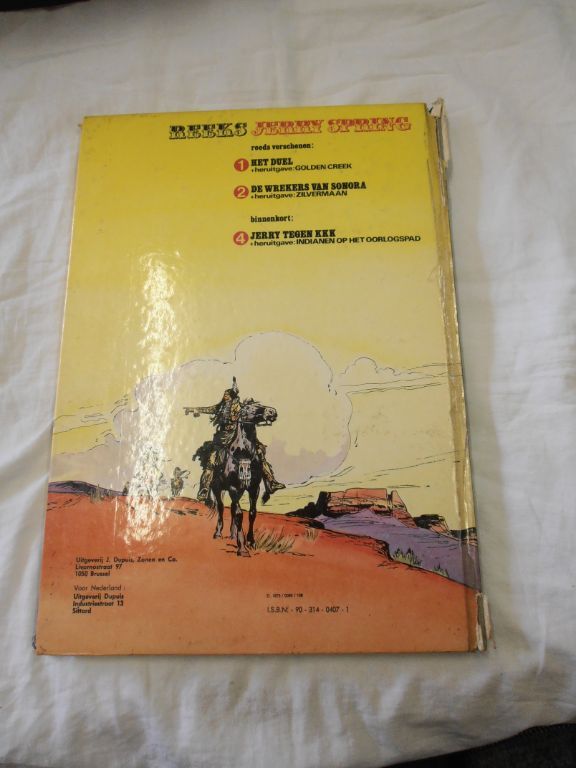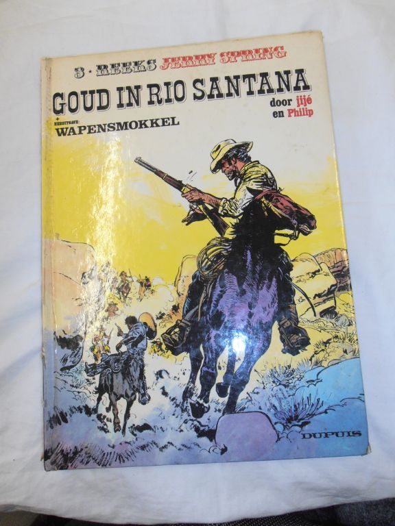 Uitg. Dupuis 1975. HC. Formaat 25,5 x 35 cm. Past door de brievenbus. Ongekleurd. 96 pagina's. Helaas heeft Dupuis destijds gekozen voor een goedkoop bindprocedé. Voor de rug werd een stukje karton genomen en daar overheen kwam de papieren voor- en achtercover. Elke boekbinder kan U vertellen, dat dit prutswerk is, de naam van Dupuis niet waardig! Deze rug heeft een schade opgelopen van ca. 3,5 cm onderaan en ca. 8 cm bovenaan. Twee hoekjes zijn geschaafd en door de rugklachten ligt het boek een tikkeltje scheef. Het boekblok is in goede staat. Alleen heeft een vorige eigenaar gemeend enkele malen zijn naamstempel te moeten plaatsen. Verder ziet het boek er goed uit. Prijs € 17,50. Verzendkosten vanaf € 3,95.