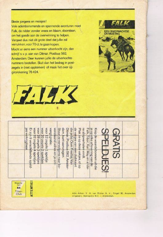 Uitg. Metropolis/van Ditmar. 1964. Gekleurd. Scheurtje boven in rug van 2 cm. Bovenste nietje begint los te raken. Scheurtje beneden in rug van bijna 1 cm. Scheurtje in achtercover boven van ca. 5 cm. Naam op pagina 3 boven. E.e.a. lijkt veel, maar valt in de praktijk mee. Het boekje ziet er nog zeer appetijtelijk uit voor zijn leeftijd van ruim 55 jaar. Gewicht 38 gram. Verzendkosten geadviseerd minimaal € 2,73. Prijs € 19,95.