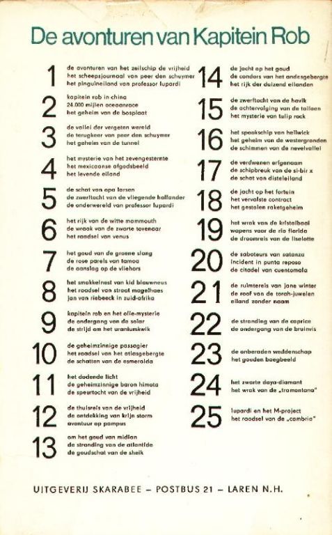 Hierin opgenomen de volgende verhalen: nr. 13 – De schat van opa Larsen nr. 14 – De zwerftocht van De Vliegende Hollander nr. 15 – De onderwereld van professor LupardiEerste druk. 1969. Paperback. 253 pagina's. Op het ...