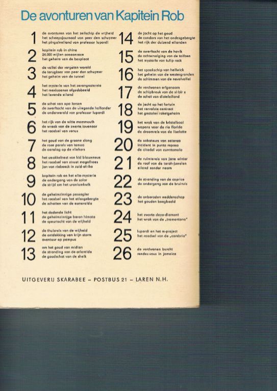 Hierin opgenomen de volgende verhalen: nr. 4 – Kapitein Rob in China nr. 5 – 24.000 mijlen oceaanrace nr. 6 – Het geheim van de BosplaatDerde druk, 1972. Paperback. 240 pagina's. Lichte gebruikssporen, o.a. wat ...