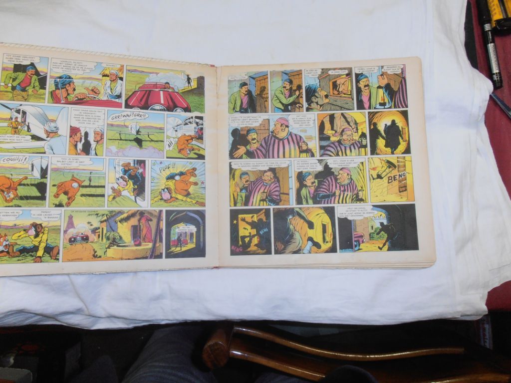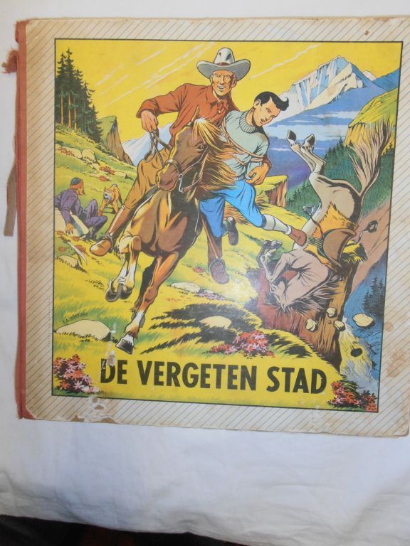 Uitg. De Spaarnestad. HC. 1961. Deel 3 in de hardcover serie. Deel 5 in de oorspronkelijke verhalenreeks. Dit boek heeft een wat moeilijk leven meegemaakt. Het linnen van de rugband is deels los en deels verdwenen. Er zitten wat lelijke plekjes op de voor- en achtercover. Het boekblok zelf ziet er vrij goed uit. Gewicht 441 gram. Formaat 27,2 x 28 cm. Past dus niet door de brievenbus. Prijs € 7,50. Verzendkosten vanaf € 5,--.