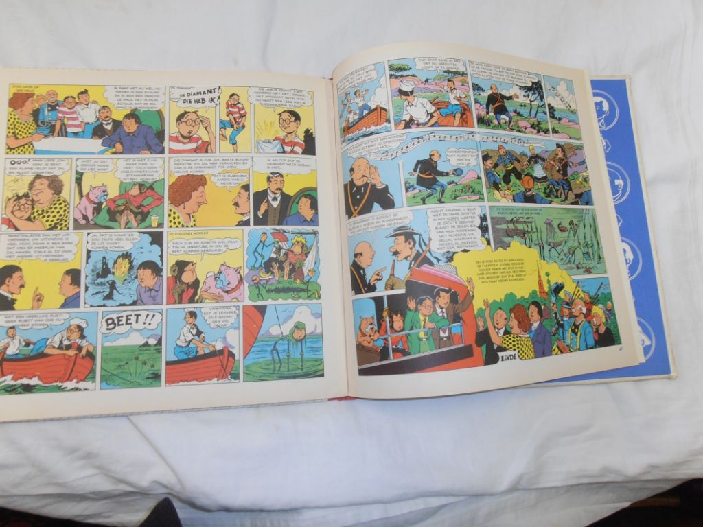 Uitg. Trouw. 1948. 84 pagina's. Oblong stripboekje. Voorkaft bovenaan een klein vetvlekje. Achtercover heel licht kreukje en bovenaan scheurtje van 1,5 cm. Wat ouderdomsvlekken. Rug bovenaan ca. 5 mm open. Het bovenste nietje heeft wat ...