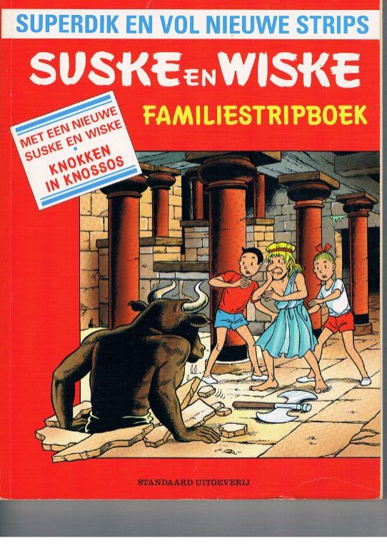Voorzijde: Knokken in Knossos. Afgifte 1/6/90. Dit is de variant met “Familiestripboek” in gele letters op de rug. Dikte 1,4 cm. Gewicht 514 gram. Hoewel het boek er zeer goed uitziet, merk ik toch enkele minpuntjes: bovenaan de cover een scheurtje van 5 mm en rechtsonder een klein kreukje. Verzendkosten vanaf € 4,35. Prijs € 9,95.