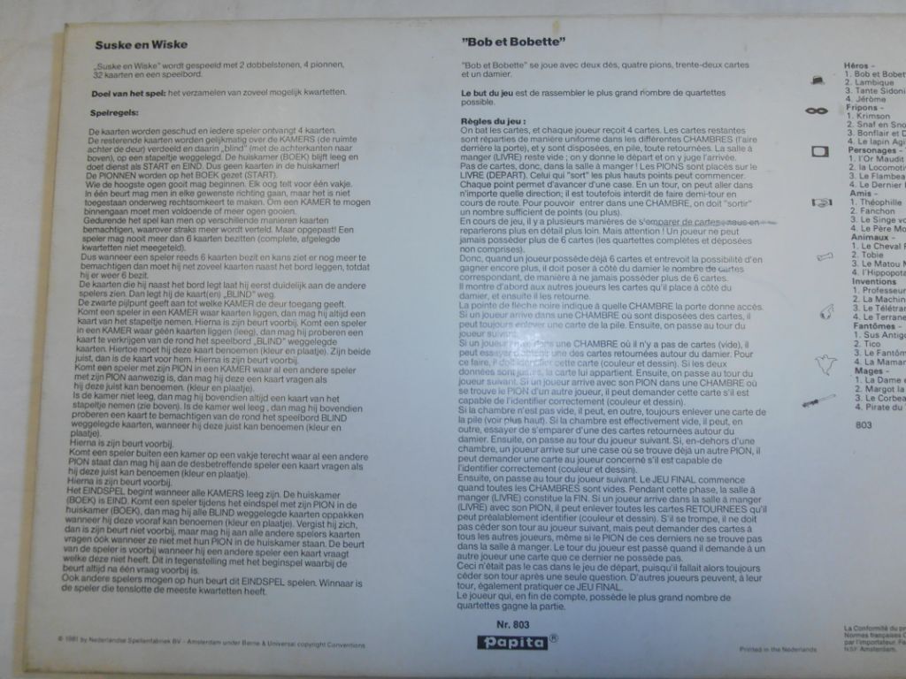 1981. Bestaande uit 8 x 4 kaarten, 2 dobbelstenen en 4 pionnen. En uiteraard een speelveld. De doos heeft wat beschadigingen. De kaarten bestaan uit de volgende kwartetten: Boeven, TV-figuren, Vrienden, Dieren, Uitvindingen, Geesten, Magiërs, Helden.