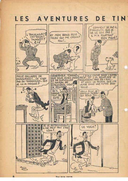 Met o.a. 2 pagina's Tintin en Extreme-Orient en 2 pagina's Quick et Flupke. Allebei ongekleurd. Het boekje is in redelijk goede staat. Links 2 perforatie gaatjes. De rug is vanaf onder voor ca. 21 cm ingescheurd met aan de voorzijde 3 x 0,5 cm papierverlies. Het houthoudende papier heeft hier en daar een rafeltje opgelopen. Aan de voorzijde is hierdoor een stukje papier van ca. 70 x een paar mm verdwenen. Voor ca. 87 jaar oud vind ik het meevallen. Gewicht ca. 28 gram. Prijs voor dit zeldzame boekje € 75,--. Verzendkosten in overleg.